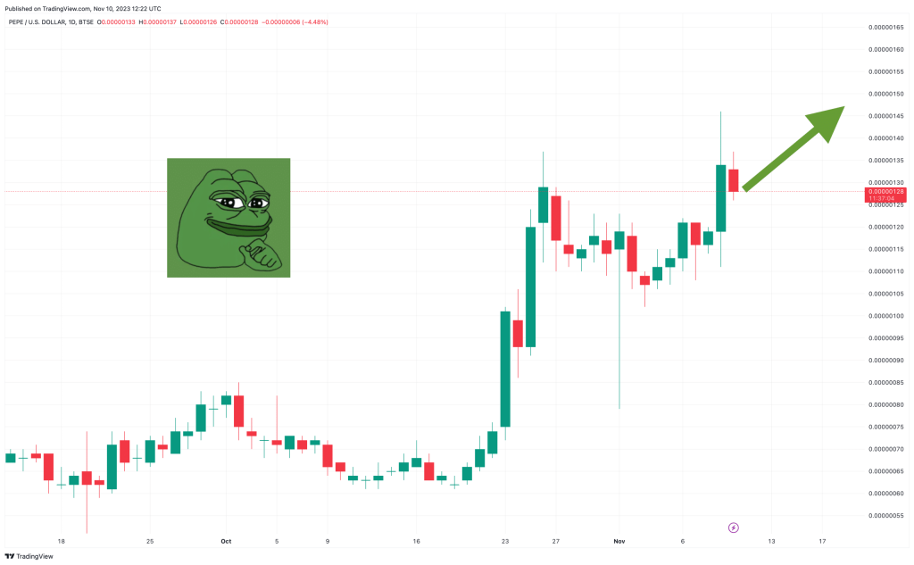 And even though it has risen strongly in the past couple of weeks, it could still continue to rise as 2023 ends, with the coin remaining 69% down from its all-time high of $0.00000431.