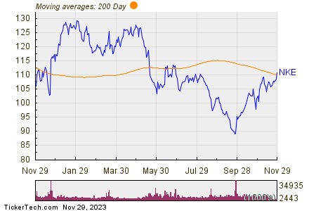 In trading on Wednesday, shares of Nike crossed above their 200 day moving average of $110.30, changing hands as high as $112.15 per share. Nike shares are currently trading up about 2.1% on the day.