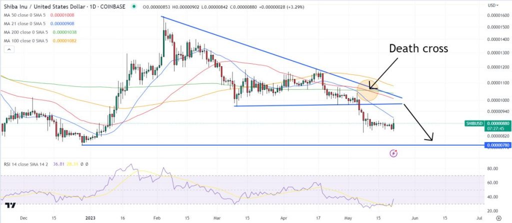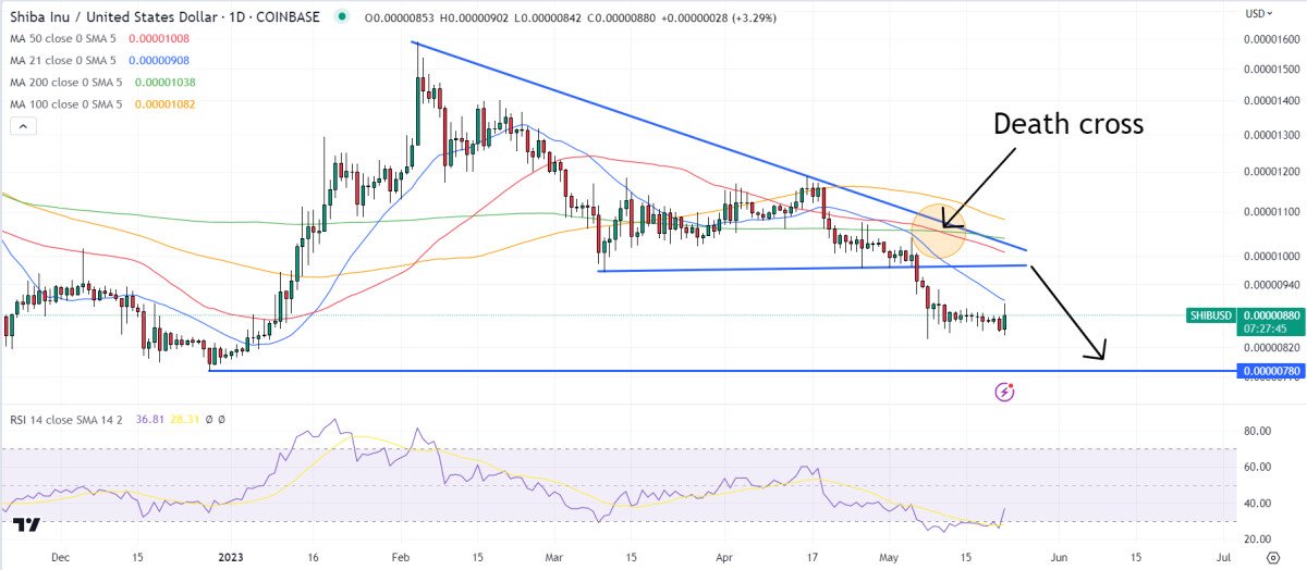 Indeed, SHIB continues to face elevated technical selling pressure in wake of the downside breakout from a long-term pennant structure and the cryptocurrency’s recent “death cross”.