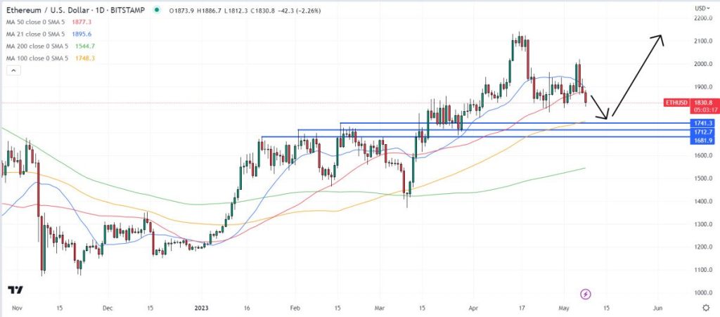 ETH/USD was last trading around $1,830, down over 2.0% on Monday and down more than 9% from last week’s highs to the north of the $2,000 level.