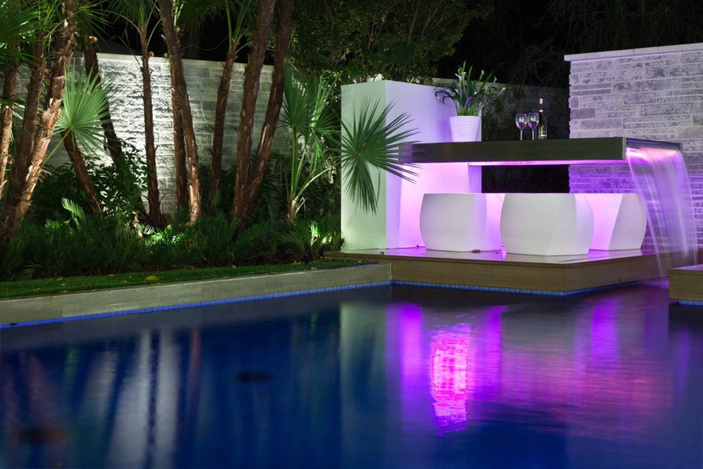 “I’ve created several ‘water tables’ with glass tops to provide poolside dining as you watch the water flow through the tabletop and cascade into the pool,” shared Kean. “I particularly enjoy incorporating LED lighting into this design as it creates an incredible wow factor in the evenings as the colors reflect off the water to create a magical ambiance.”