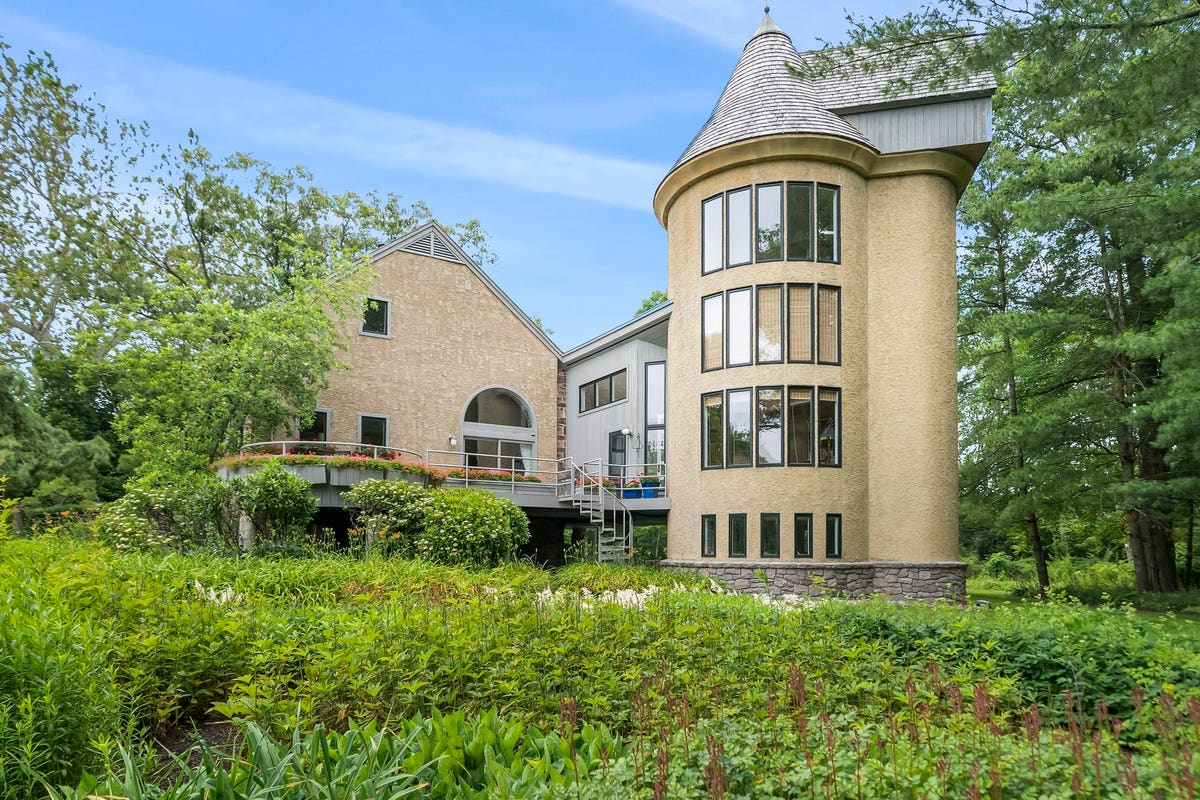 A Pennsylvania estate features a home built around a circa-1801 bank barn, accented by a dramatic modern silo and surrounded by lush gardens that lend the property a storybook feel.