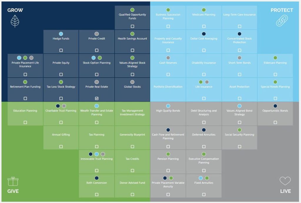 Here’s an example of a reordering of wealth management through this elemental lens, where the color coding denotes areas of overlap, indicating where individual strategies may offer benefits from more than one pillar of planning:
