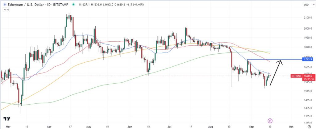 ETH was last trading around $1,620, with the cryptocurrency still finding resistance at its 21DMA, though it remains up around 5.7% from earlier weekly lows.