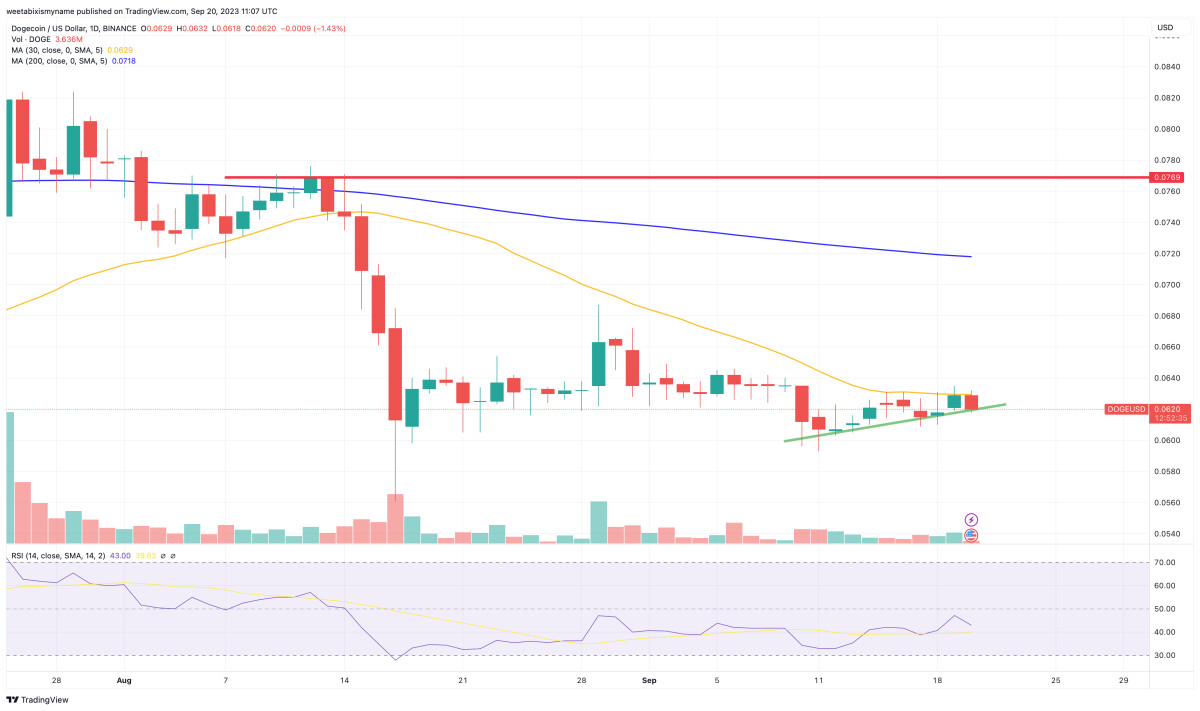 The Dogecoin price has risen as high as $0.063254 today, with the meme token now sitting on a 1% gain in the past week.