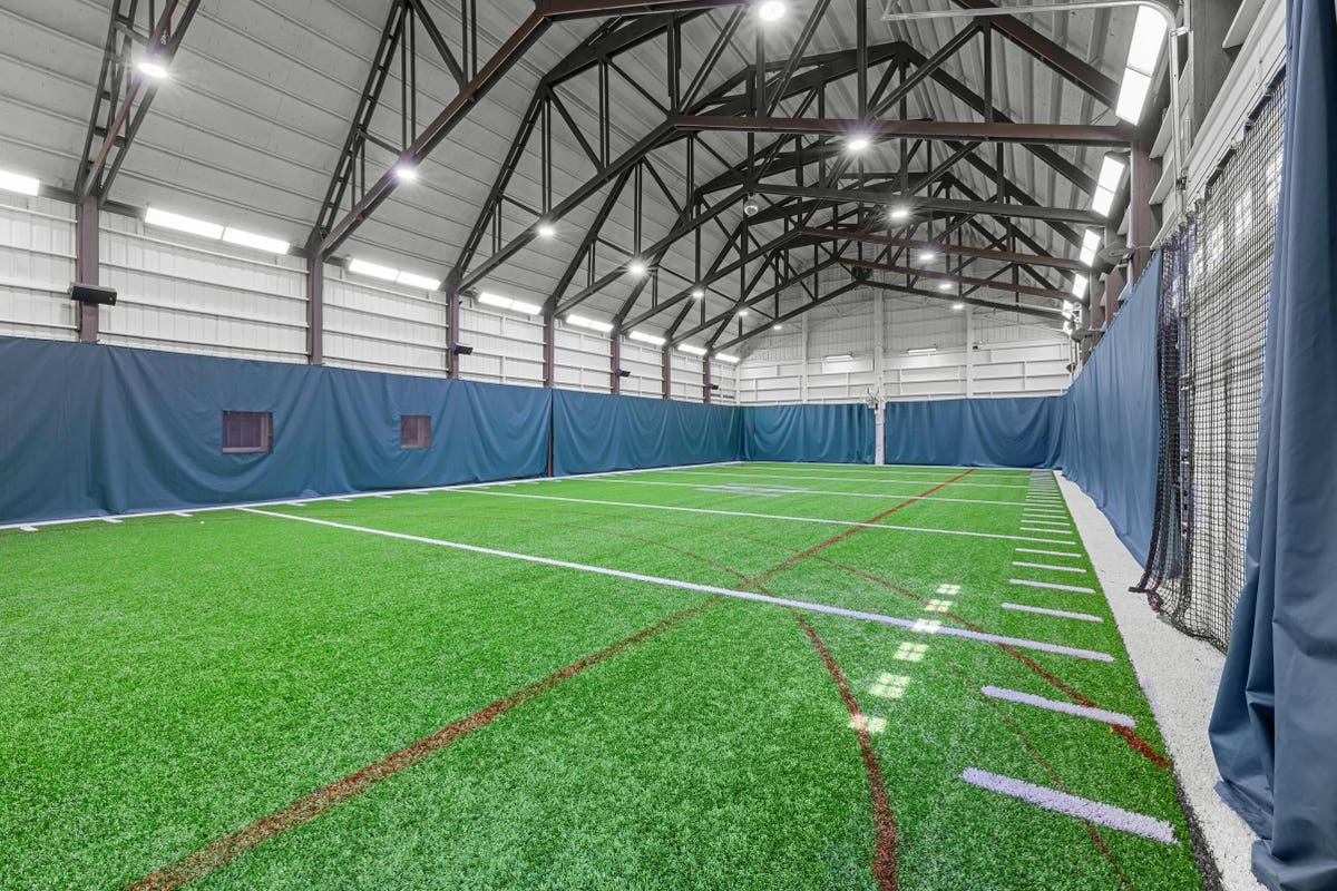 The 4,600-square-foot space is covered with indoor turf and equipped with lighting, speakers and two bay doors with net enclosures to keep balls from going astray. Retractable basketball hoops are installed at either end. The adaptable space could be used equally for sporting workouts or entertaining.