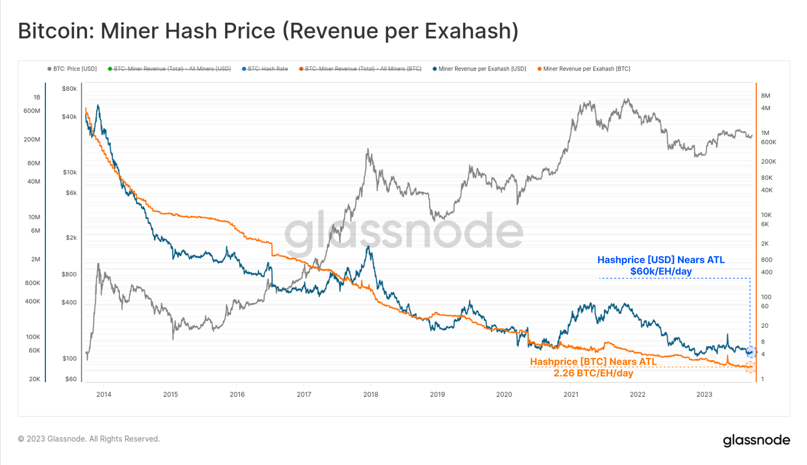 “This has driven the hash price, being the BTC or USD reward earned per Exahash, towards new all-time-lows. Miners will now earn just 2.26 BTC (~$60k) per Exahash active on the network,” the report reads.