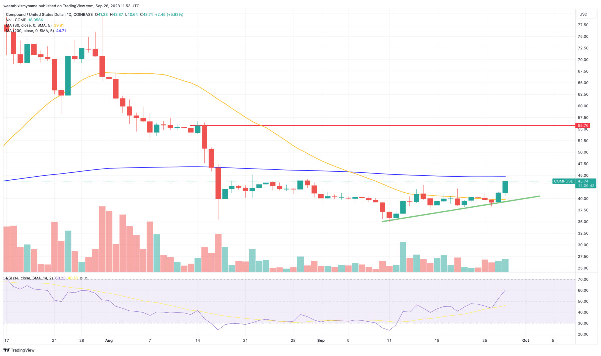 The price of Compound (COMP) has rallied strongly this morning, with the altcoin’s ascent to $43.51 representing a 7.5% gain in the past 24 hours.