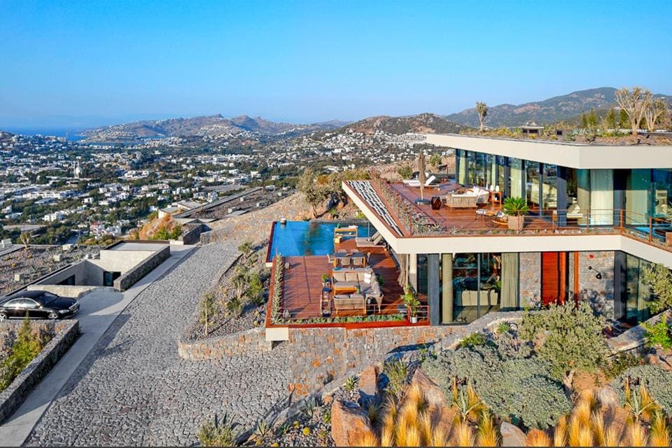 The villa is near the Yalikavak Marina, beach clubs, restaurants and shops. It is set within a 9.7-hectare (24-acre) development landscaped with bougainvillea, myrtle and sandalwood trees. Six- and seven-bedroom unfurnished villas are also available starting at €5.6 million or about USD 6 million.