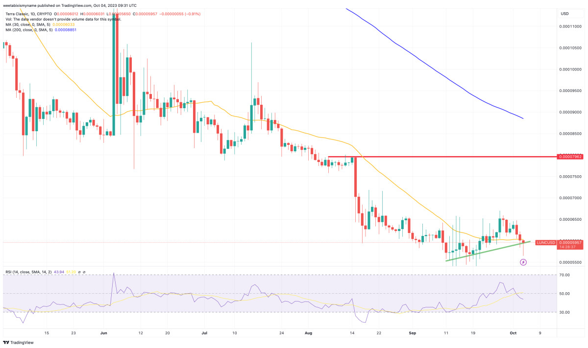 The Terra Luna Classic price has dropped by 3% in the past 24 hours, with its fall to $0.00005928 leaving the altcoin in 100th place in terms of cryptocurrency market cap rankings.