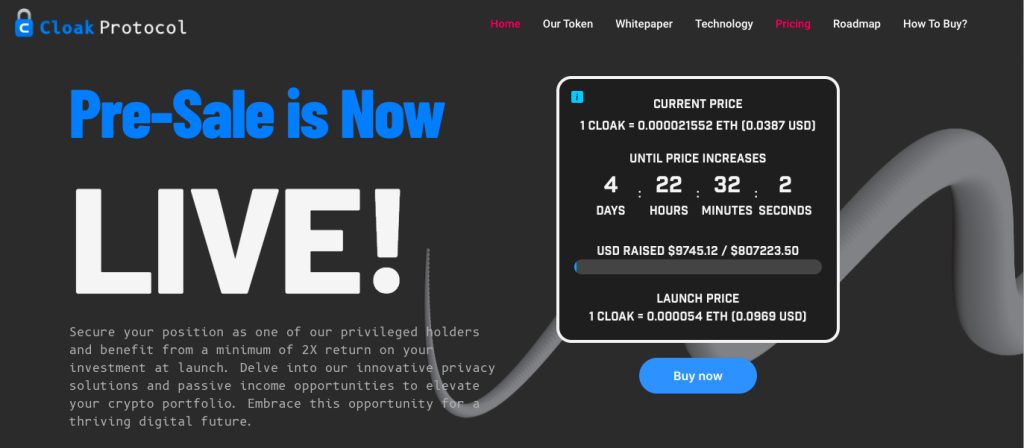 To be a part of this community, users can buy $CLOAK through the ongoing presale. Currently, the token is priced at only $0.0387 per token. However, the exchange launch price is set at $0.0971 per token, a 150% price jump.