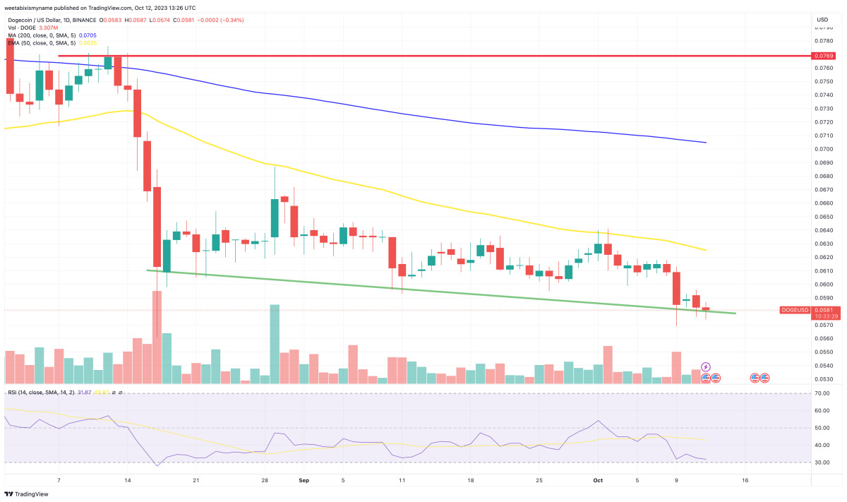 The problem is, however, that DOGE’s support level (green) continues to decline, and there’s every chance it could be broken yet again, with a move below $0.580 potentially opening the floodgates to further losses.