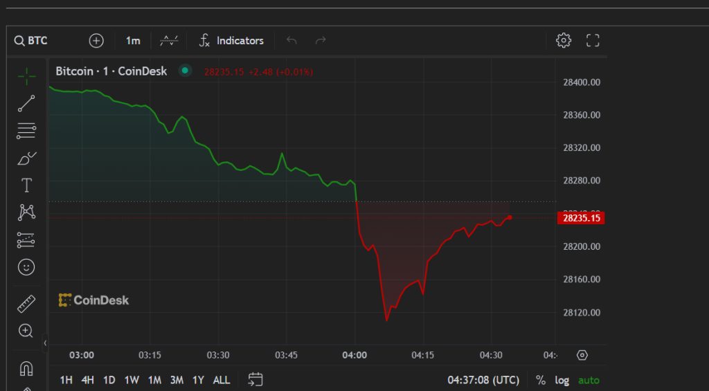 Following this upward movement, bitcoin pulled back, trading below $28,300 at the time of this report, additional CoinDesk figures reveal.