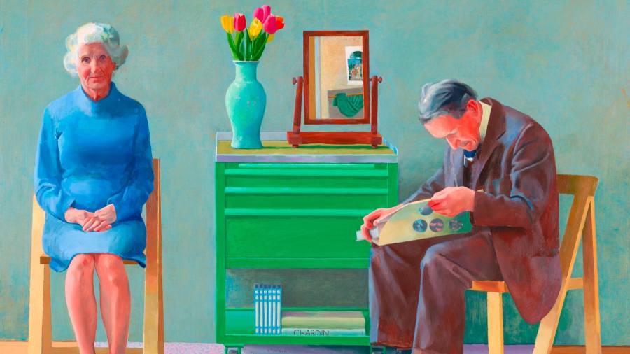 In David Hockney’s double portrait “My Parents” (1977), the British artist paints a domestic scene that one imagines reflects his view of the central aspects of his parents’ personalities, and how he understood the relationship between them. The artist’s father, his head bent over a magazine in his lap, is slightly more in the foreground of the canvas, although his attention is clearly directed away from the artist, the viewer and his own wife seated beside him in the picture. His feet are not fully on the floor, as though he were restless and impatient to be released. This is a person fully in his own world, despite being in the presence of his family.